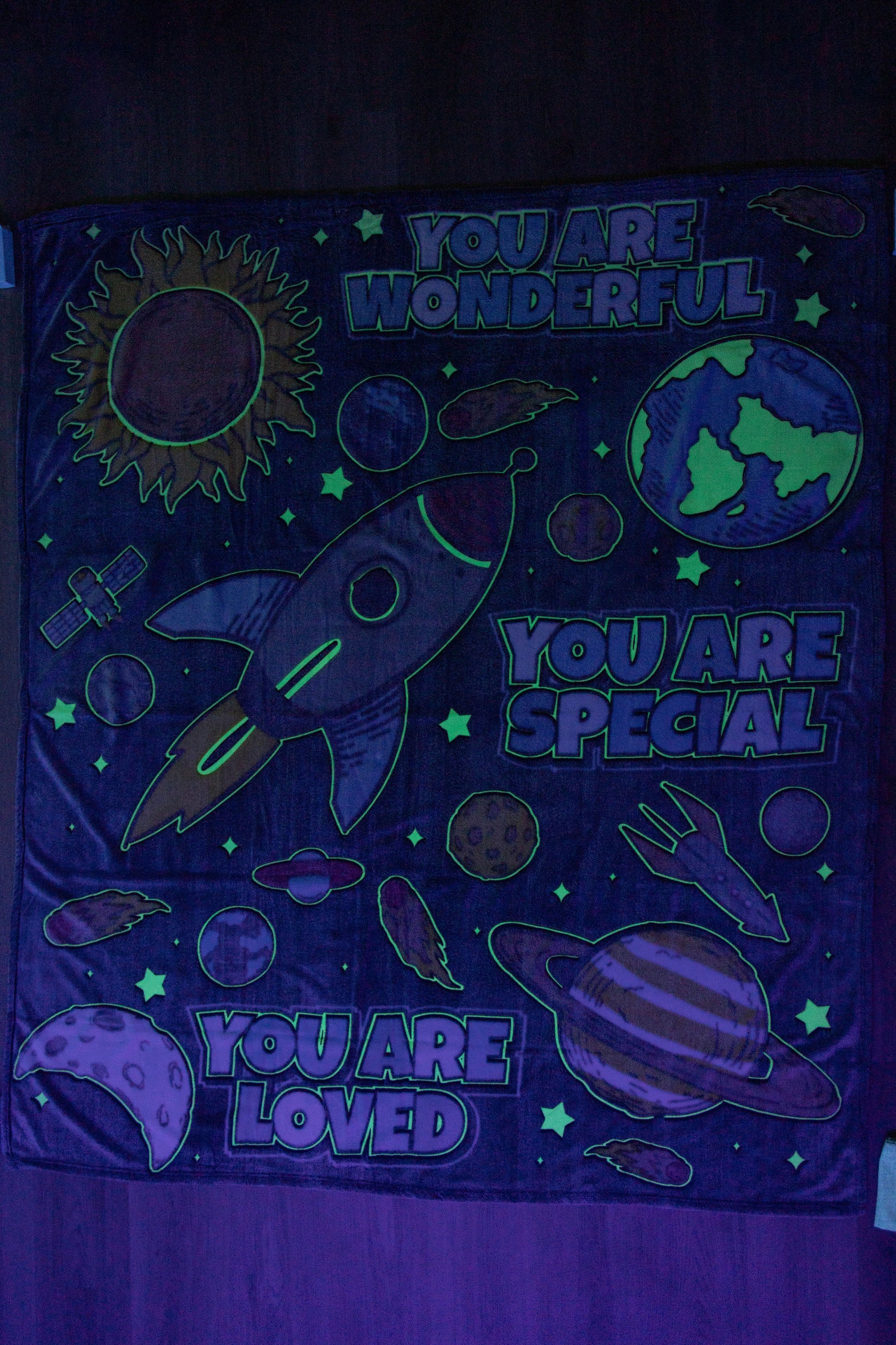 Glow in the Dark Blanket- Dress up your kids and teens' bed with our fun kids throw blanket that glows in the dark and includes words of affirmation. The space themed cute blanket allows kids to feel comforted and cozy!